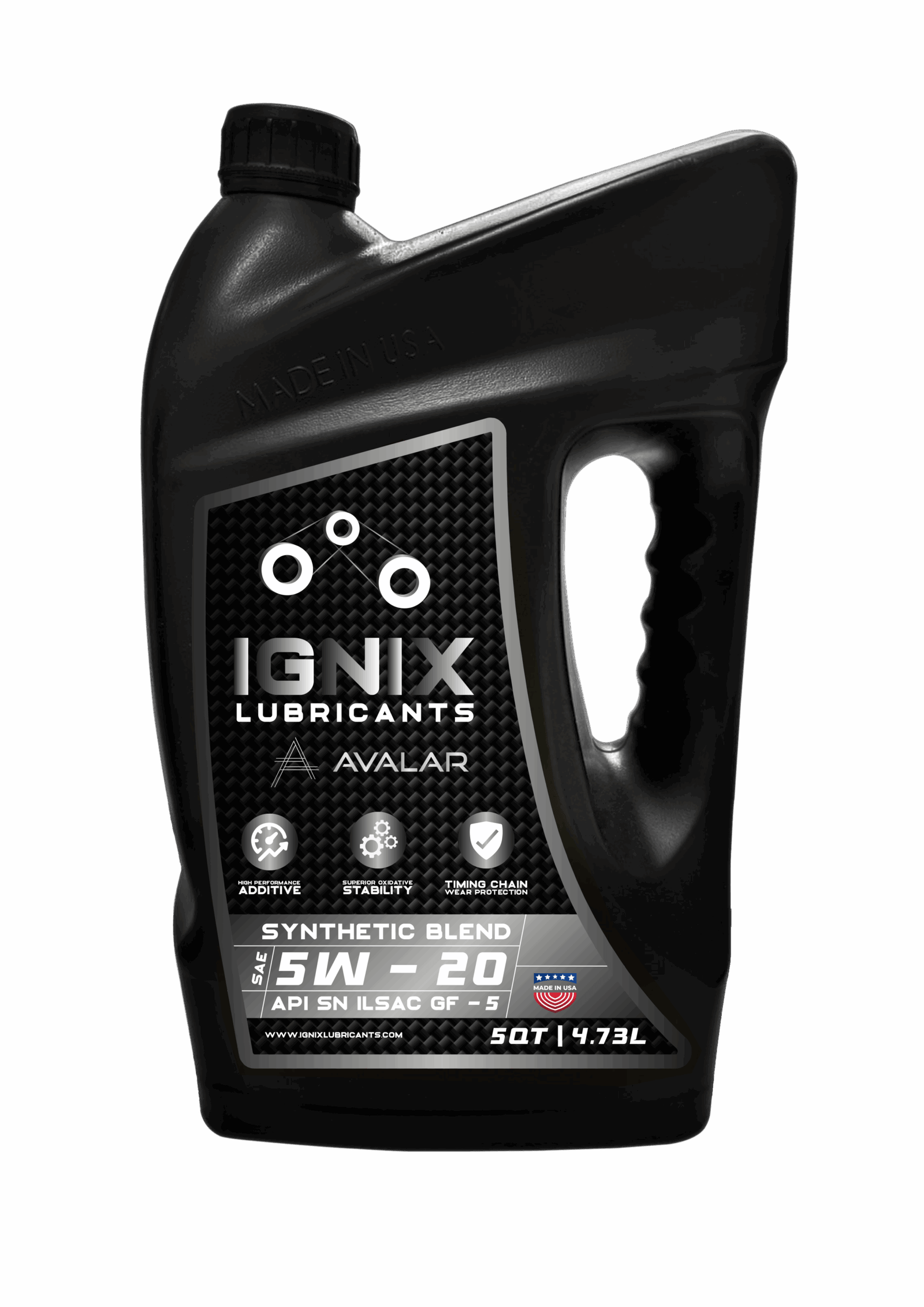 Ignix Avalar Synthetic Blend Motor Oil, SAE 5W-20, API SN, ILSAC GF-5 formulated with a blend of conventional and synthetic base oil and a premium additive package.